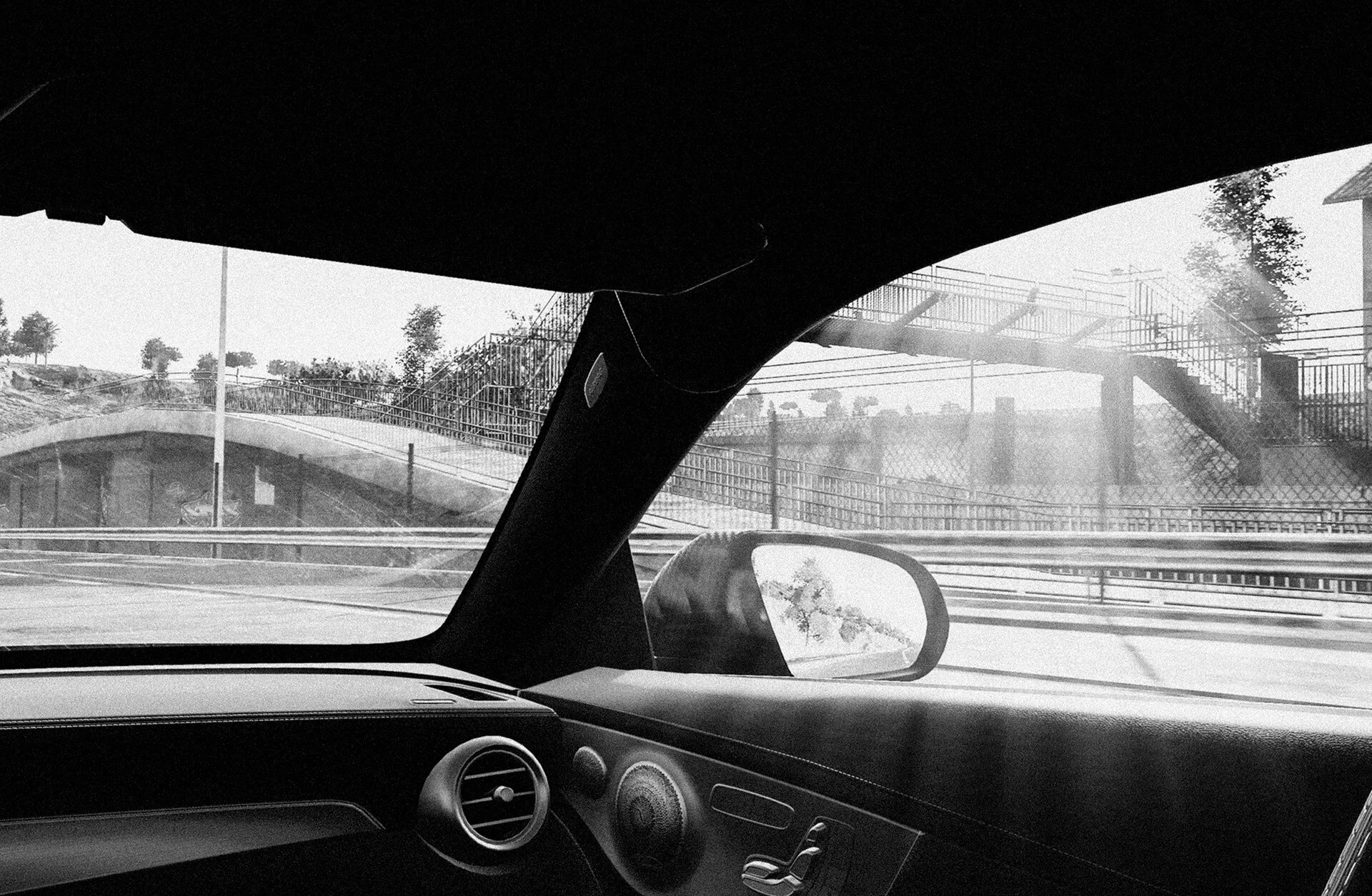 Backseats is a photographic project by Sao Palo-based artist Leonardo Sang. These images of glowing black and white landscapes, blurring slightly from the speed, dissolving into out-of-focus grey in the distance, are all shot from the passenger seat of some of the world’s most beloved cars… Or, at a closer inspection, are the passenger seat of the finest digital simulations of these exotic machines that the bleeding edge of realistic video games can provide. Even more curiously, the camera is no more real than the cars and landscape. Perhaps unsurprisingly, given the long history of cars and photography, these driving simulation games (such as Forza) used by Sang are the host for some of the most sophisticated virtual cameras ever implemented, leading the industry in implementing full DSLR replica controls and film stock emulators. But aside from serving as a report from deep in the uncanny valley, the most critical turn in the Backseats project is Sang’s abdication of driving to the video game’s AI so he can focus all of his attention on making photographs. This move fundamentally challenges and reorients our preconceptions about what players are supposed to be doing in a videogame, collapsing the 3D models used to prototype and manufacture cars, the history of using composited CG automobiles in film and advertising, and ultimately asking the question of what it means to loiter in the digitally simulated sublime rather than grasp at traditions of competitive “gameplay.”