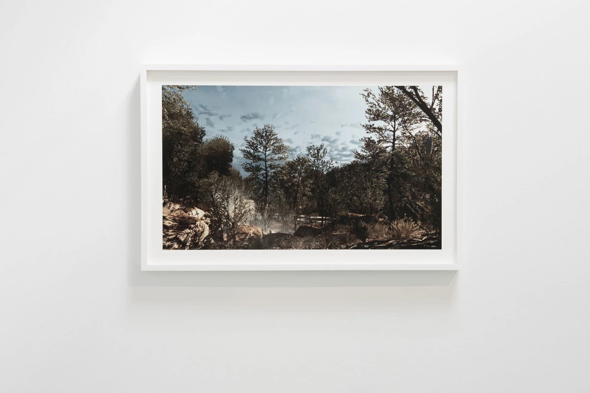 Mark Tribe’s Rare Earth series is comprised of videos of forested militia training camps in America juxtaposed with large photographic prints of screenshots of equally lush levels from first-person shooter video games. The work initially seems to be teasing out connections between macho fantasies of violence and our visual language for representing beauty in the genre of landscape. But over time, the combination starts to unfold another register: the way that some Western traditions of realism and macho dominance combine to form the notion of “the sublime” that is a fantasy of white, male, heterosexual anxiety. By plunging into the uncanny valley, digitizing the real landscape on large LCD screens, and making the digital worlds of video games physical with sumptuous photographic prints, Tribe crafts a subtly multilayered project that draws together and implicate the complex of violent fantasy and historical realism that produces an imago of the natural landscape as a theatrical site for violence.